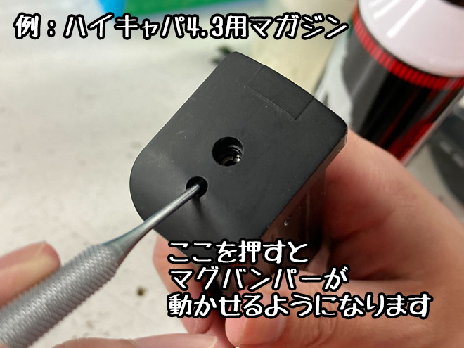 そのままではマガジンの底にアクセスできないので、マグバンパーを取り外します。