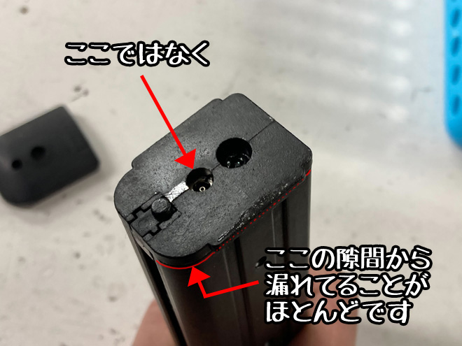 実はガスガン(特にハンドガン)のマガジンは、マガジンの筒部分と底部分にパーツが分かれており、今まで自分が直したガス漏れのほぼ全てがこの隙間からのガス漏れでした。