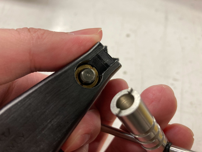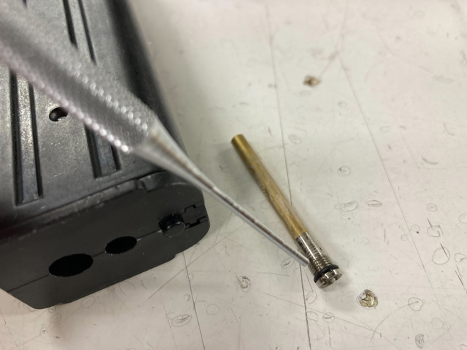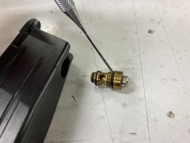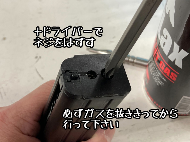 放出バルブを押してマガジン内のガスを抜ききり、圧力が一切掛かっていない状態にします。