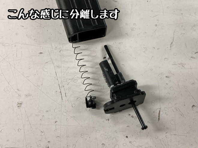 マガジンの中にはBB弾を押し上げる為にバネが入っているため、外した勢いでパーツが飛んでいかないように注意しましょう。