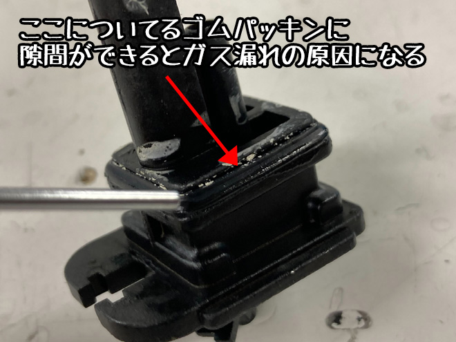 ここには最初からうっすらとグリスが塗られており、それがパッキン周りの更に微細な隙間を埋めることでガス漏れを防いでいるのですが、段々劣化してくるとグリスが乾いたりゴムパッキンが変形することで隙間ができ、ガス漏れが発生します。