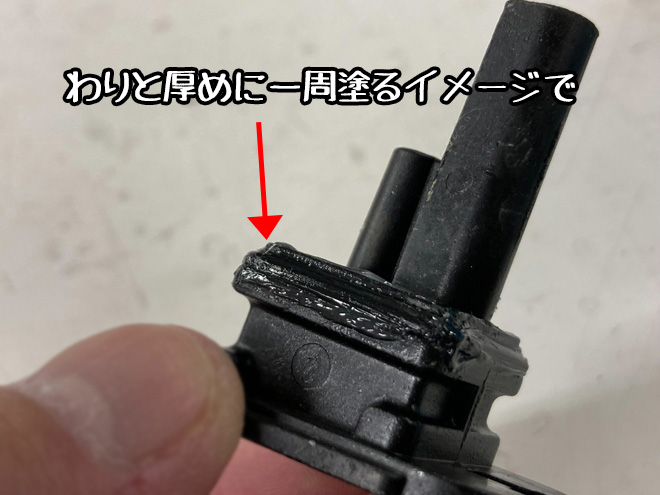 バルブを取り外したら、写真のピンポンチで指し示している部分に先程と同様シリコングリスを塗り、付け直すだけです。