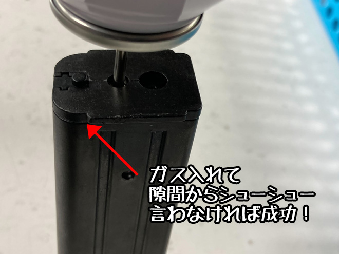 組み立て終わったらマガジンにガスを注入し、ガス漏れが起こっていないかを確認します。