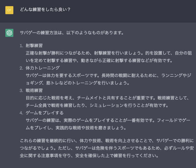 - サバゲーの練習は、実際のゲームをプレイすることが一番有効です。フィールドでゲームをプレイし、実践的な戦術や技術を磨きましょう。