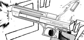 現在では自動拳銃最大の弾薬である.50AE弾を使用することで有名な銃だが、シオの使用するものはそれ以前にラインナップされていた.44マグナム弾仕様。リム付きの薬莢が描かれているのが確認できる筈だ。