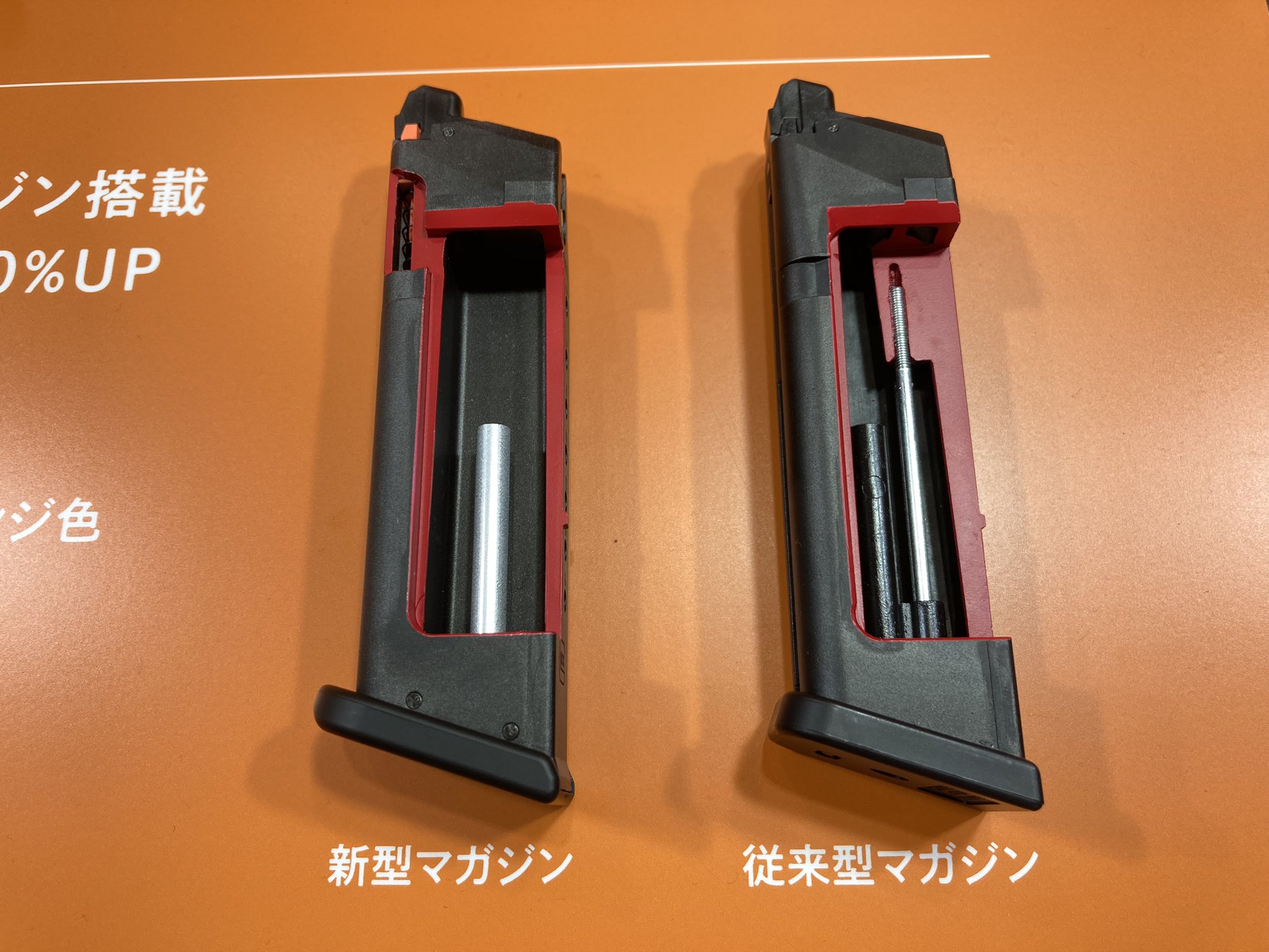 おまけに新型はBB弾を押し上げるマガジンフォロワーがオレンジ色に変更されています。