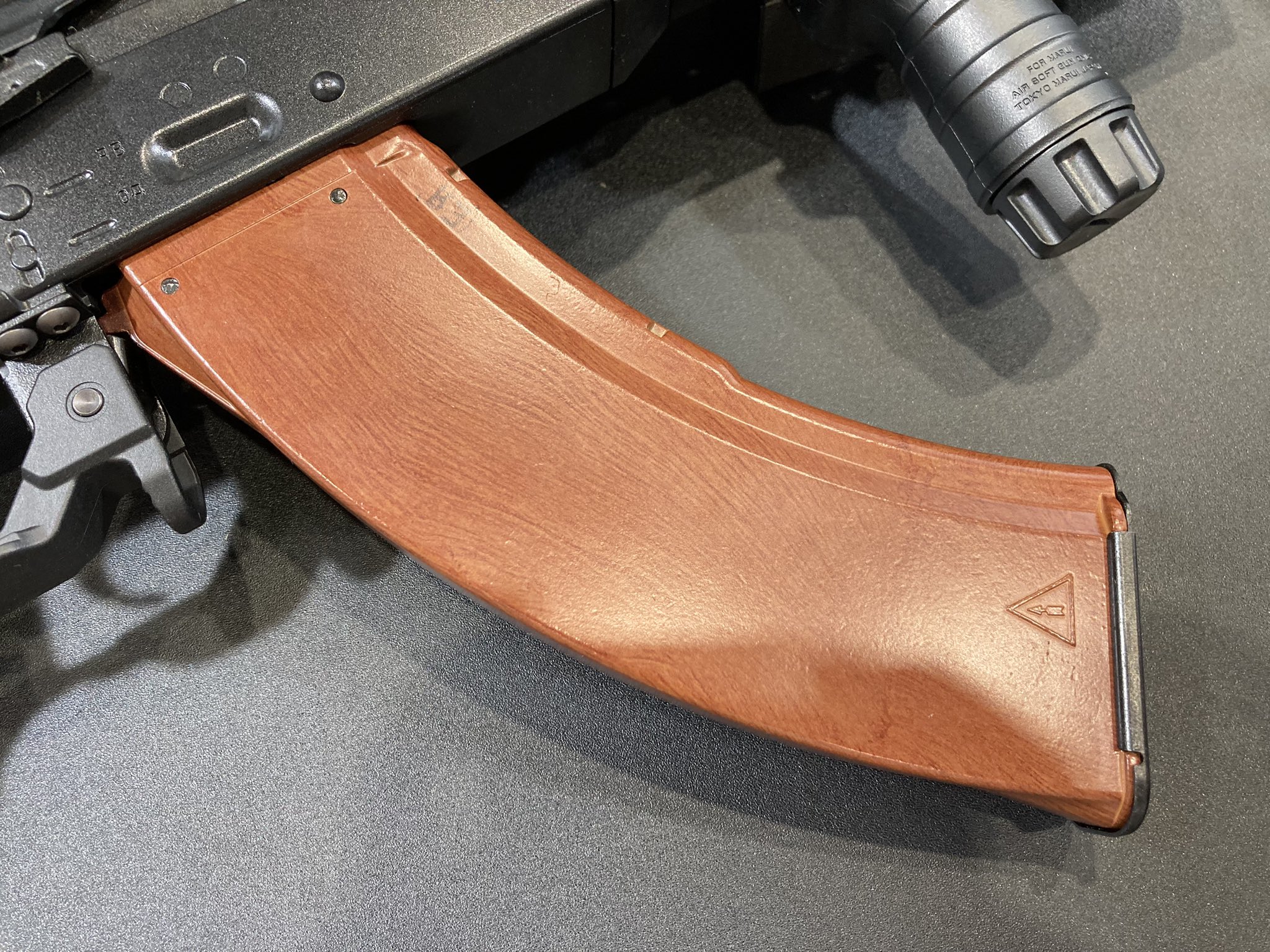 この茶色いマガジンは実銃においてAK47→AKMへアップデートされた際に設定されたもので、ベークライトという素材で成形された樹脂マガジンの一種。