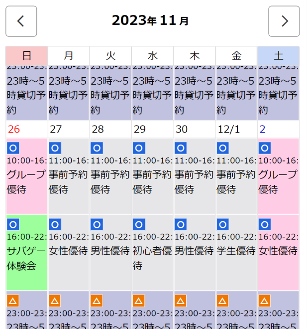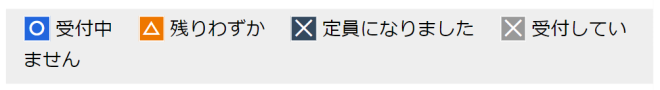 予約カレンダーにはこのように、現在の予約状況が記号で表示されるようになっています。