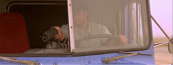 トラックジャックに合いトラック運転手が銃を出し防衛するシーン
