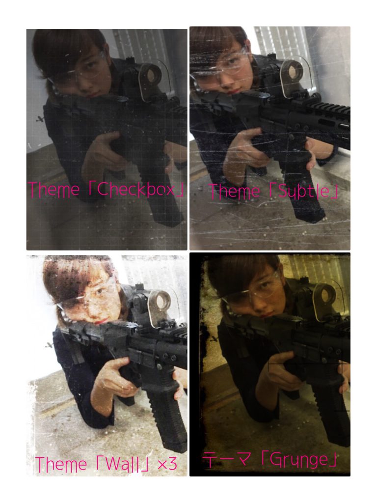 ③効果→フレーム→テーマ「Grunge」「Scan」「Viewfinder」