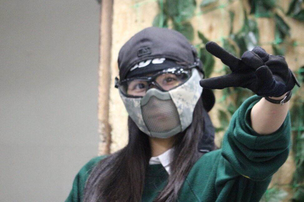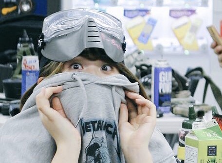 彼女は猫面とサンセイのマスクの口元部分、目元の保護にBolleのシューティンググラスを使用しています!