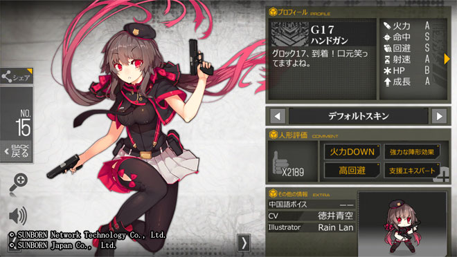 物語の中核となるエリート部隊「AR小隊」の一人。序盤ステージをクリアするだけで手に入る上、味方強化のスキルを持っているので、手に入れたら育てておきたいキャラクターです!