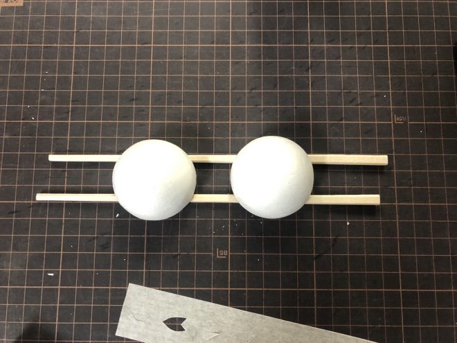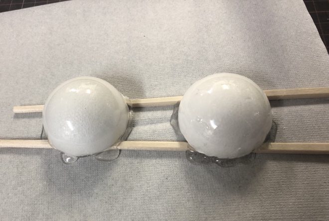 次に割り箸の上にこの球体を置きます。割り箸の下には汚れても良いように紙や新聞紙を敷いてください。
