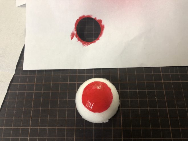 これをスチロールにかぶせて、その上から赤い絵の具を塗りたくります。満遍なく塗るために、同じ方向に筆を動かして塗りましょう!
