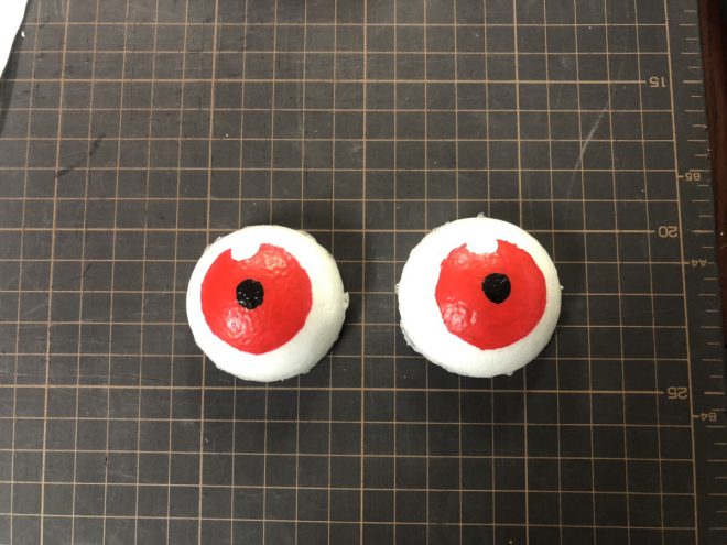 そして忠臣のヒーロースキル(必殺技のようなもの)である「グリード拘束呪式解放」を行なう際にも関係する、両手の甲の目玉。これは球体の発泡スチロールを切り抜いて作っていきます。