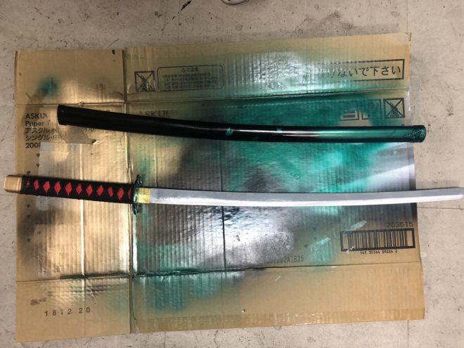 刀から作りたいところではありますが、個人的にゲームセンターで取ったいらない刀のおもちゃがあるので、これをペイントして作っていきたいと思います!