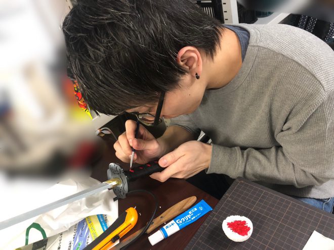元の色が黒の柄巻の中に白という構成だったので、その白い部分に赤い絵の具で着色していきます。