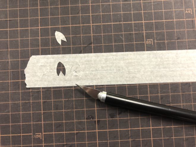 マステを切り取ったら、しっかり乾かした鞘の黒で塗る予定の緑色の部分に不規則に貼り付けてください。