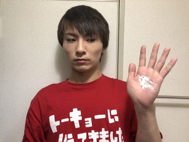 手に取る分量はこれくらい。というのもガッチガッチにセットをするので大量に使うのは確かなのですが、最初は手のひらにこのワックスを伸ばして馴染ませなければいけません。