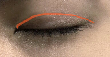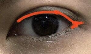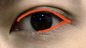 この赤色で塗った部分に沿ってアイラインでなぞります。今回はこの上部分のみをなぞります。