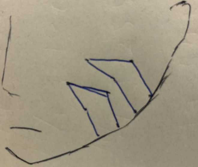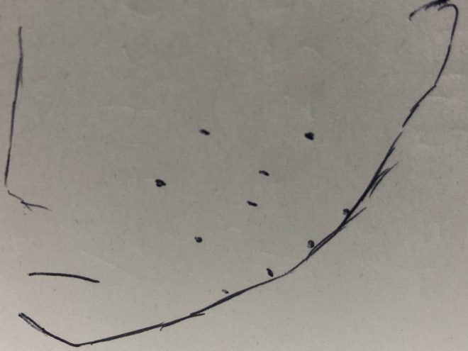 まず傷跡の頂点部分だけを先に頰に描いていきます。(黒い点)