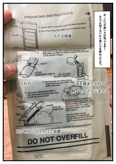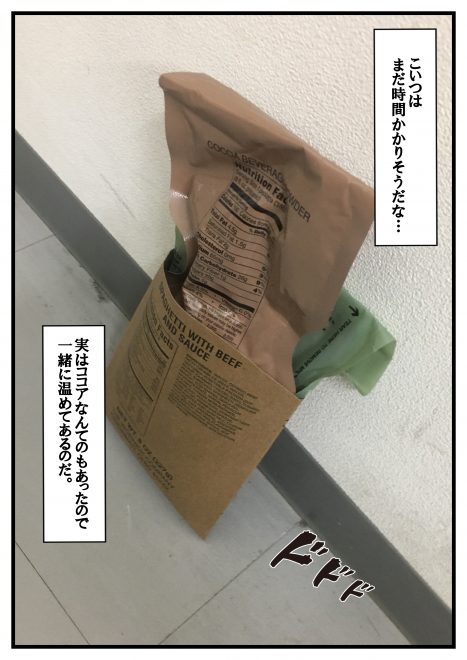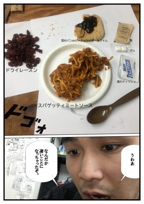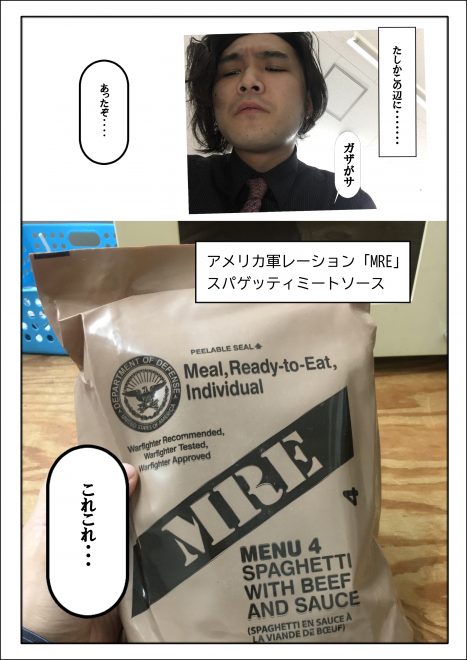 MREはMeal, Ready-to-Eatの略で、今回の記事には出ていませんがかなり種類があります。今回はその中で 一番うまそうなスパゲッティミートソースを選んだわけです。