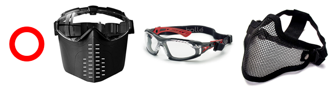 目を守る部分が金網状のものは、被弾時に割れたBB弾が中へ入る危険性がある為、使用時は内側にシューティンググラスや眼鏡など、レンズ状の物を着用してください。内側にレンズ状の物が入れられないメッシュゴーグルは使用禁止です。
